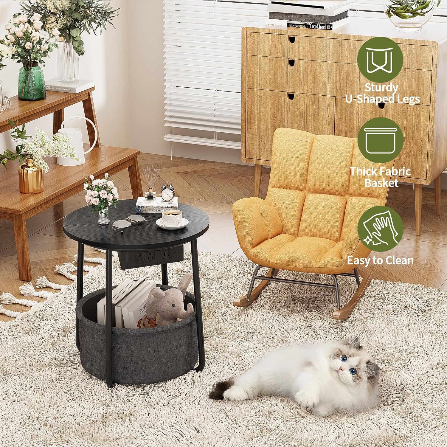 • Round Table with Storage Basket: Spacious tabletop with a sturdy fabric basket that supports up to 30 lbs, great for books, blankets, or even a cozy pet spot.