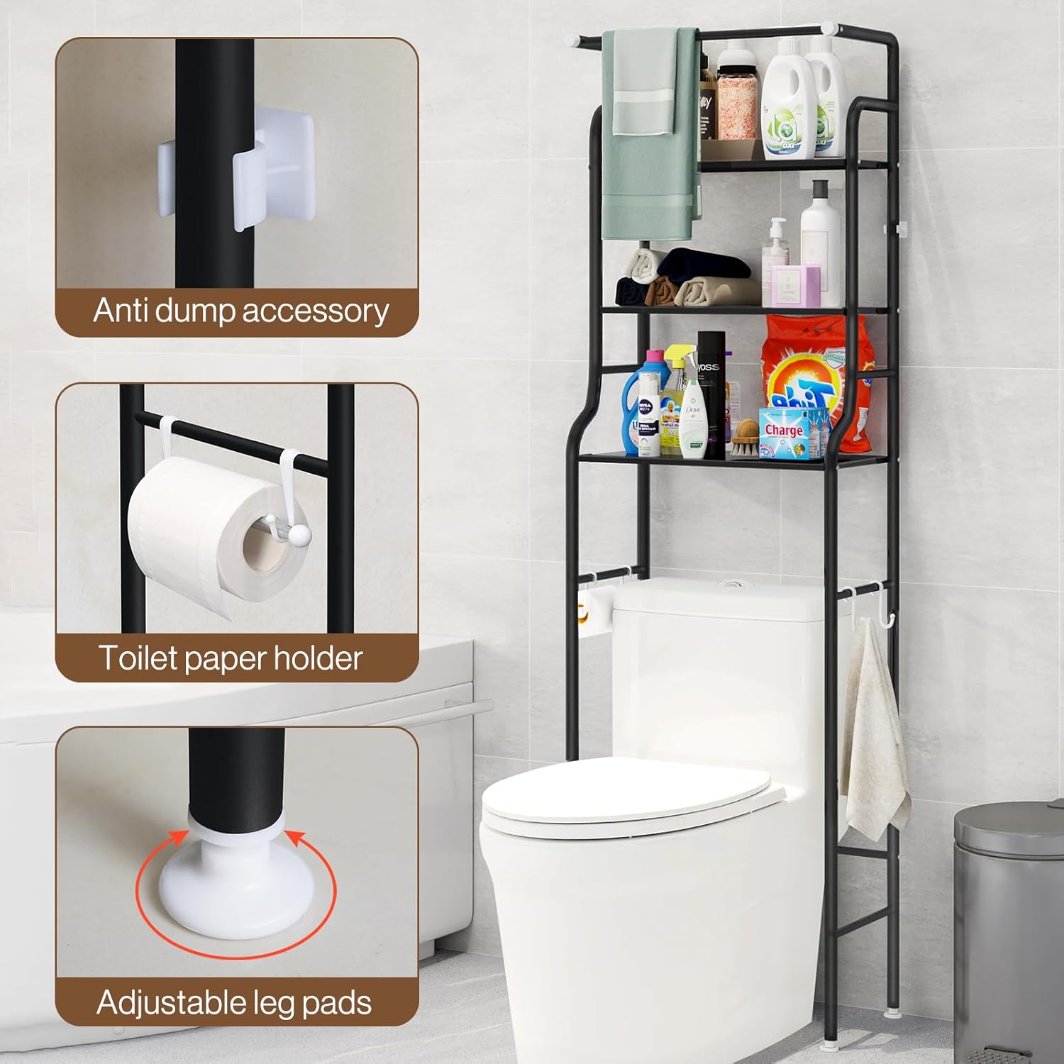 • Space-Saving Design: Utilizes vertical space above your toilet, fitting most standard sizes while keeping your bathroom neat and clutter-free.